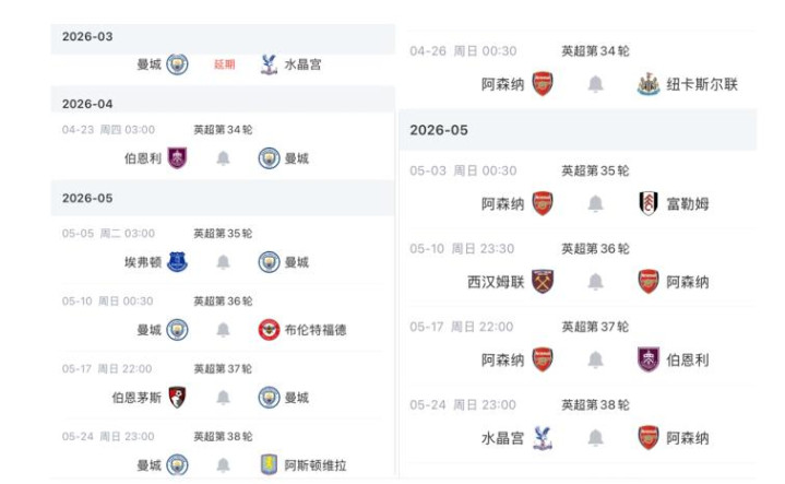 相比之下,曼城后面没有欧冠比赛,而是一场足总杯半决赛、6场英超比赛,尽管也是7场左右比赛,但是曼城的对手中强队并不多,只有水晶宫、阿斯顿维拉这两队更强一些。而水晶宫则成为了两队的争冠判官,毕竟两队最后的赛程中都要对阵他们,一旦补赛中,曼城主场战胜水晶宫,曼城将追平阿森纳的积分,而一旦水晶宫阻击曼城,则立刻帮助了阿森纳,非常有意思。同时,还有一种情况,双方最后1轮结束后很有机会同分,这样就要看净胜球和相互胜负关系了。看来,英超争冠悬念还要继续。